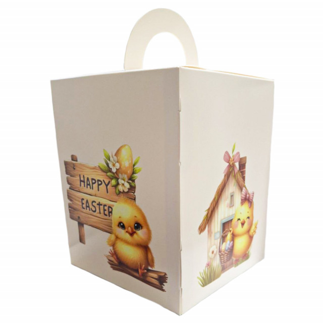 Приват24 payКоробка для кулича С цыпленком бежевая с окошком - коробка из мелованного картона с весенним принтом цыплят, цветов и яиц. Имеющееся прозрачное вертикальное окошко из плотной пленки подходит для праздничной упаковки пояса.