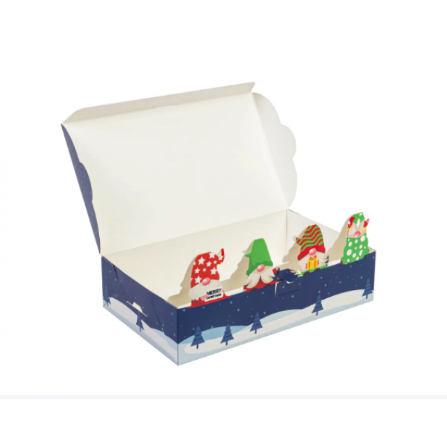 Перевага коробки - закривається досить щільно, при цьому замки і декоративна передня панель виконані в новорічному стилі. Коробка стійка до пошкоджень, не рветься, не прогинається і не деформується. Таким чином, Ваша випічка залишиться не пошкодженою при транспортуванні.