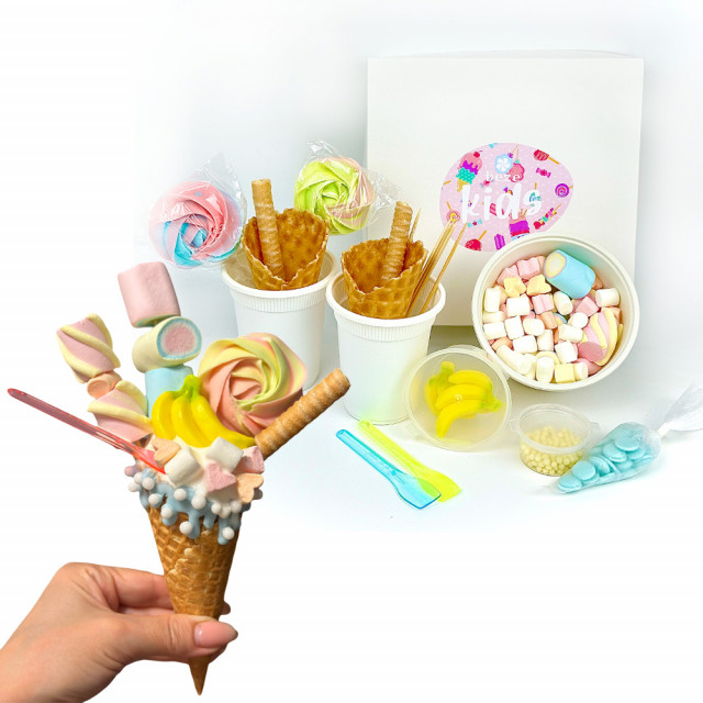 Также в наборе есть палочки для формирования "шашлычков" из маршмеллоу, ложечки для мороженого и инструкция. Набор рассчитан для декорирования 2-х рожков. Мороженое в набор не входит!