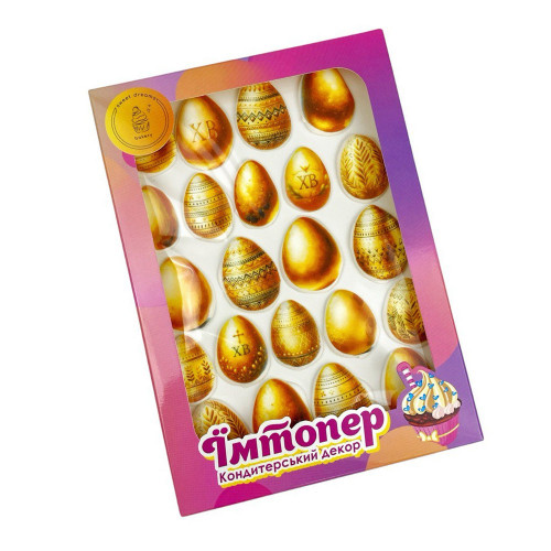 Набор съедобных украшений Яйца золотые – готовый декор из айсинга в виде писанок, который можно использовать как самостоятельный декор, просто вставив в десерт, а также приклеивать на готовые пряники или другие кондитерские изделия.