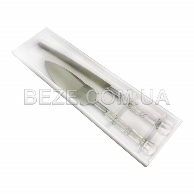 Набор Нож и лопатка для торта включает два предмета - лопатку и нож, состоящих из двух частей: наконечники из нержавеющей стали и декоративные ручки из прозрачной пластмассы.