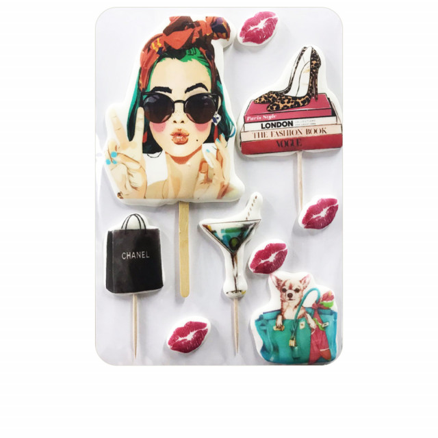 1 большой топпер, 3 маленьких топпера, 3 маленькие фигурки в виде поцелуев и 1 в виде сумочки с собачкой.