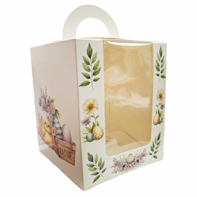 Приват24 payКоробка для паски З курчатком бежева з віконцем - коробка з мелованого картону з весняним принтом циплят, квітів та яєць. Наявне прозоре вертикальне віконце з щільної плівки, підходить для святкової упаковки паски.