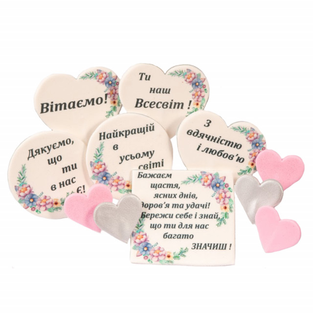 У наборі 2 кружечка, 3 сердечка, 1 прямокутник з побажаннями, 5 маленьких сердечок.